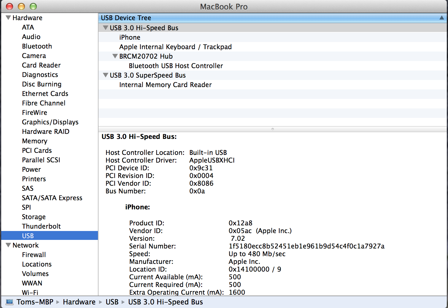 "USB 3 devices will appear in the "USB 3.0 SuperSpeed" section. Other devices will appear in the "USB Hi-Speed" section"