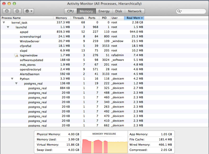 Also, there is a large (100-200) number of postgres_real processes being run by user _devicem even though the number of managed devices is fewer than 10.