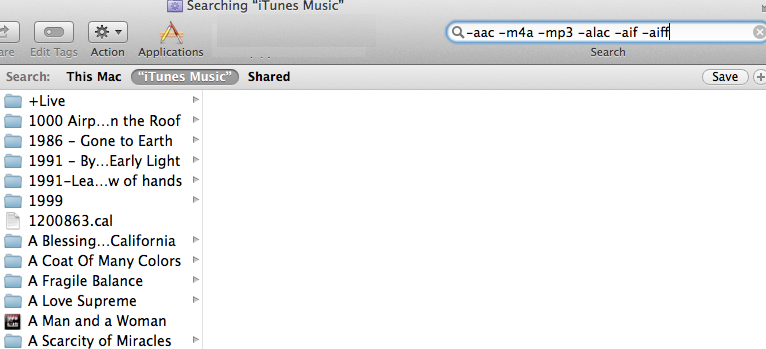 The boolean search should look something like this (started by selecting the main iTunes music folder: