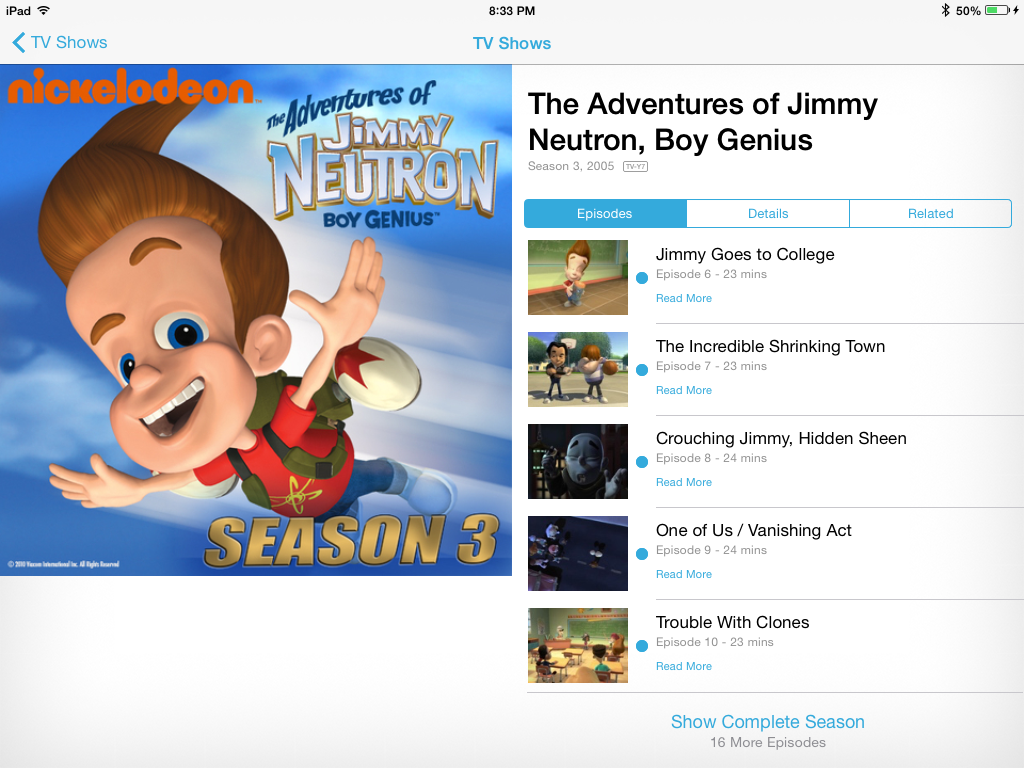 I want to add that since the latest update if the TVShow is originally purchased from iTunes the episode thumbnails works well, but if its imported it does not. At least thats my experience. Take a look at the screen grabs, Jimmy Neutron was purchased, Arrow is imported, the artwork was added manually in iTunes but the thumbnails remain empty. My guess is that Apple might have change something in the way iTunes read that screen pic. Its a shame, It worked great before this update, thing is I'm not sure if its iOS8 or iTunes, or both