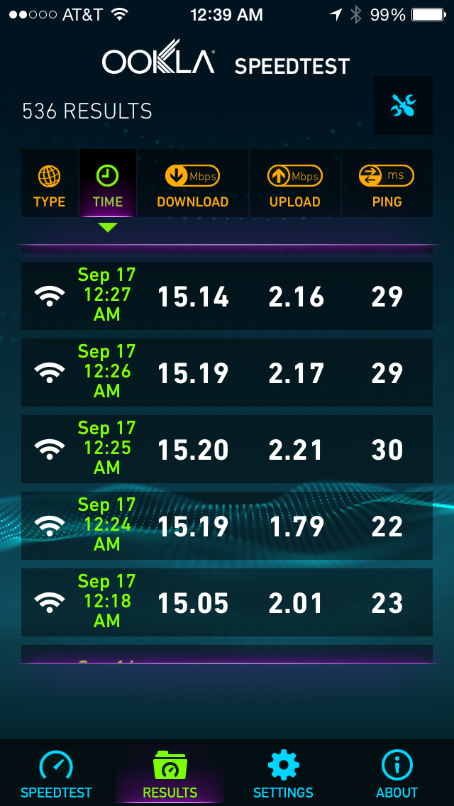 I updated my iPhone late last night and I am also pleased to report that the issues have been resolved for the phone as well. Prior to updating, i.e while still running iOS 8.4.1, I did 5 OOKLA tests with BT and AD turned ON. The 5 tests can be seen on the first screenshot below. They average 0.6 Mbps. After updating to 9, the iPhone also delivers full speeds regardless of BT and AD now being ON. The second screenshot shows 5 additional OOKLA tests performed after the iOS 9 update. They average 15.15 Mbps. This morning I did an additional 5 tests and they average 15.14 Mbps. Goodbye DiscoveryD, welcome back mDNSResponder!!!