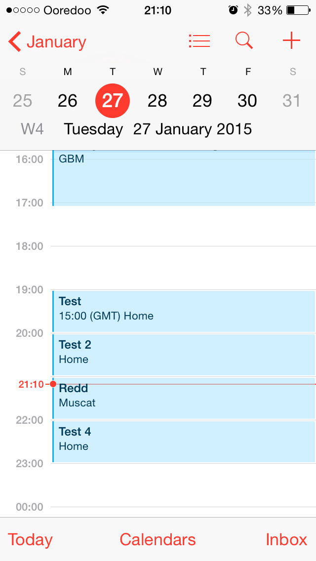 iOS 8 Calendar on iPhone showing GMT times for new events.