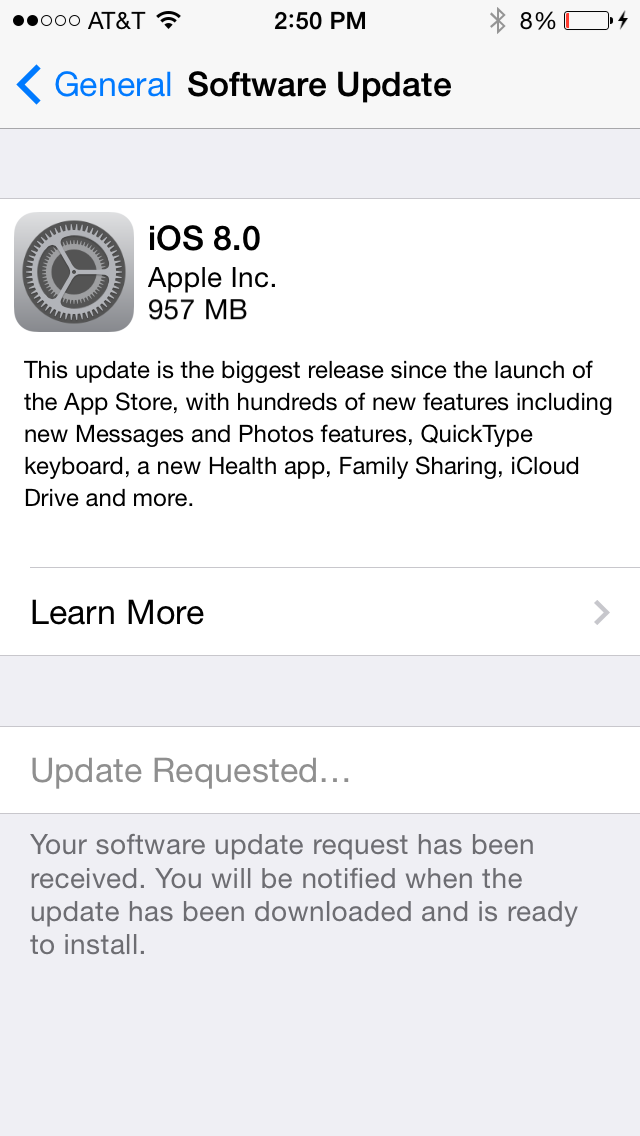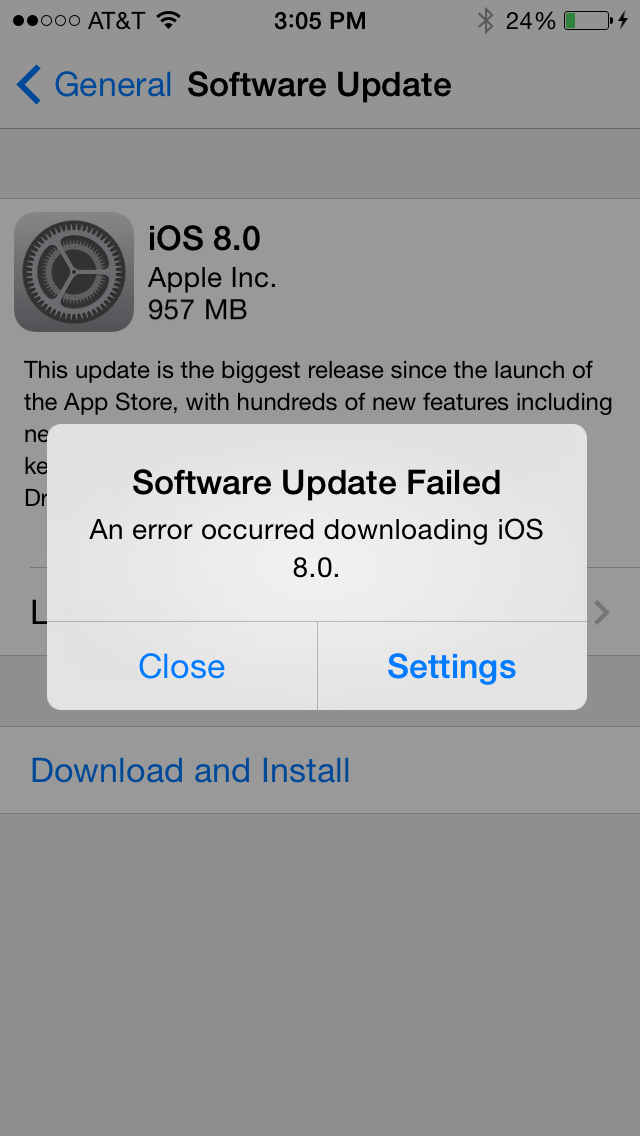 For the past few days I've been trying to download the new operating software (iOS 8.0) on my iPhone 5, but I keep getting an error message message. When I try to download the software, it says "Downloading", followed right away by "Update Requested... Your software update request has been received. You will be notified when the update has been downloaded and is ready to install." That message stays there between 10-30 minutes (every attempt to download the software had different timing). Finally, a message pops up stating, "Software Update Failed". (See screenshots attached below in chronological order.)