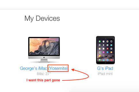 I have a similar problem, as I was trying the Public Beta of Yosemite on a external hard drive that is connected to my iMac, while keeping the onboard hard drive with Mavericks intact. In doing so I set it up as a new computer though it's the same iMac with pretty much the same name just added Yosemite in parenthesis to tell apart. Well now that Yosemite is out and I've upgraded from Mavericks, it's keeping the name I setup on the beta but still realizing it as the same computer. I tried signing out of my iCloud (iMac) and saw that it disappeared on the iCloud website 🙂 only for it come back as this name again once I setup iCloud back on the iMac 😟. My thinking was that since I have the correct name I want on my iMac, it will overwrite on the iCloud website but that doesn't seem to be the case. I no longer have the beta on that external hard drive since its been erased and reformatted. Really would like to fix this issue as well.