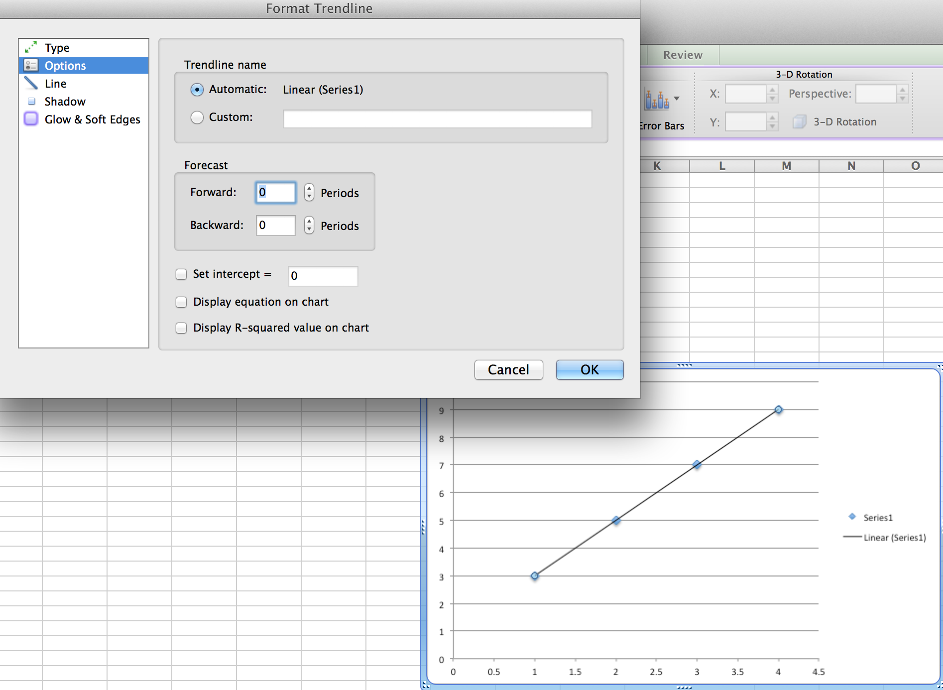 But there are no options on a chart for forcing the trend line to go through Y=0. You will have to ditch the chart's trend line and create a trend line in your table. Add a new column to your table, use LINEST to calculate the slope with an intercept of 0 and create two or more data points for the trend line. Plot it as a second series.