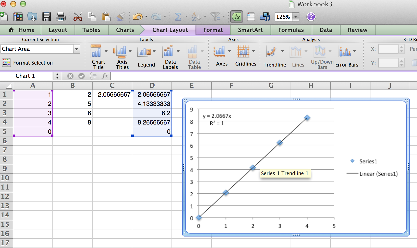 The value in D1 becomes the name of series in the chart legend. Being a trend line, I made the name be the trend line equation