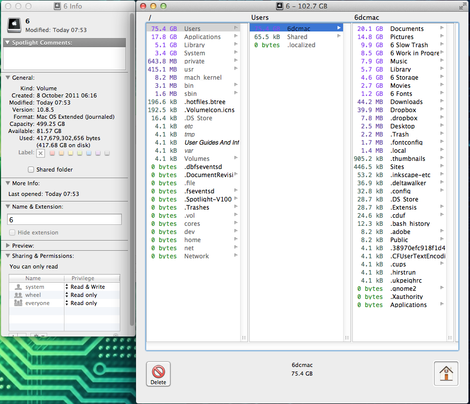 So there's about 320Gb of hard drive space that's being eaten up, but I can't see where. I have been doing some heavy work in iBooks Author, so I opened up the iBA files and deleted the previous versions. Won back a bit of space, but not a dent really. I think the local snapshot versions are actually pretty small.