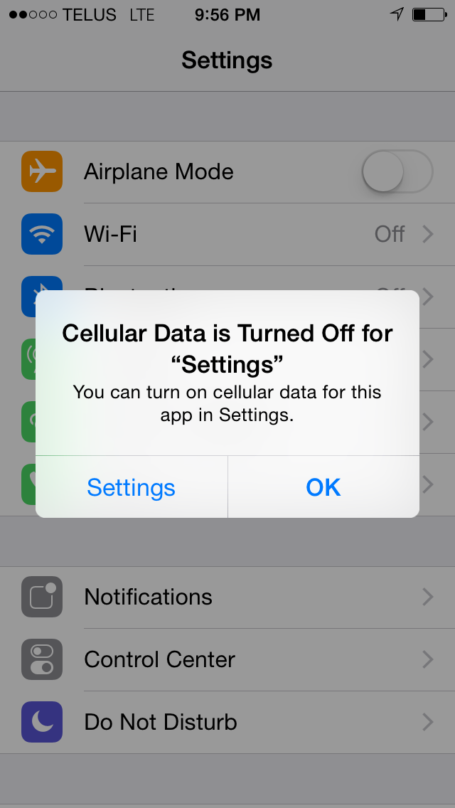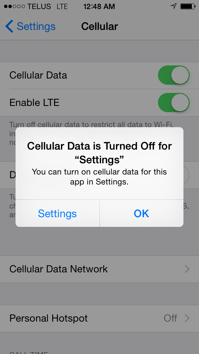 Cellular data is turned off for "Settings"