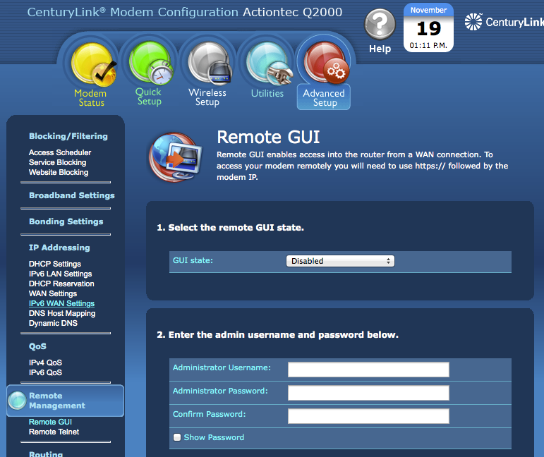 Find the settings for Remote Management, or something similar. This is how it looks for a CenturyLink DSL modem under the advanced setup.