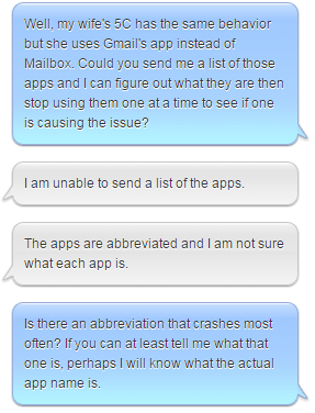 I was surprised they refused to just send me a list of the app abbreviations so that I can look for a common app that my 5S and 5C use which could be causing this. Maybe Safari is the common link. I don't believe that they can't figure out exactly what apps are crashing. Those apps have identifiers which we can't see that will shows them exactly where they are in the app store 😝.