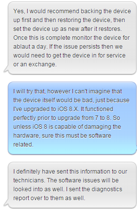 So, after no joy with the 8.1 upgrade, I decided to try the Apple chat support. It was a surreal experience. Here are interesting excerpts: