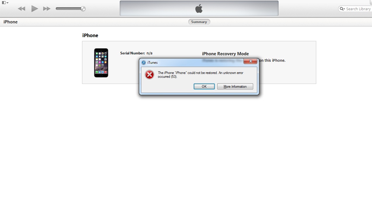 Problem is i got these error on bounth iphone 6 i have.at 50% verification software give error 53 and stop