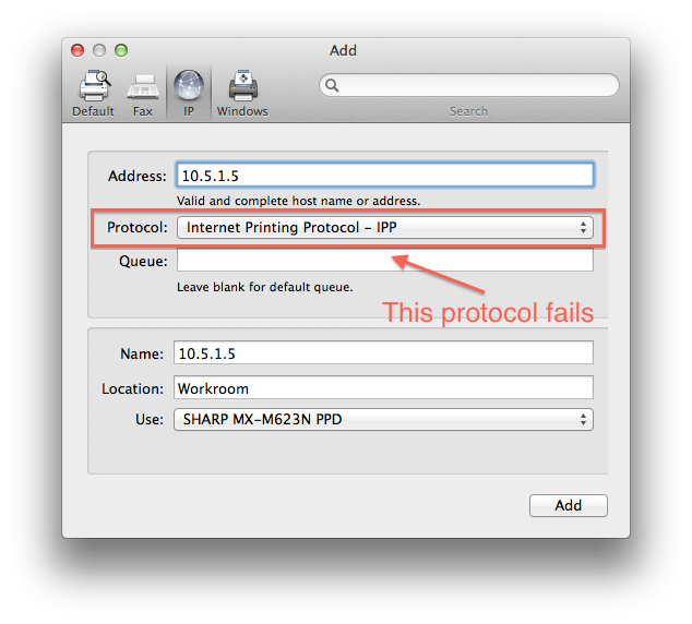 When I enter the printer IP address into the Mac Printer & Scanners settings, Mac OS tried to interrogate printer model etc and it comes back with a Generic Postscript Printer profile and not the HP specific one. (Again, every other computer can setup fine at this point!)