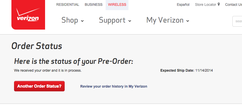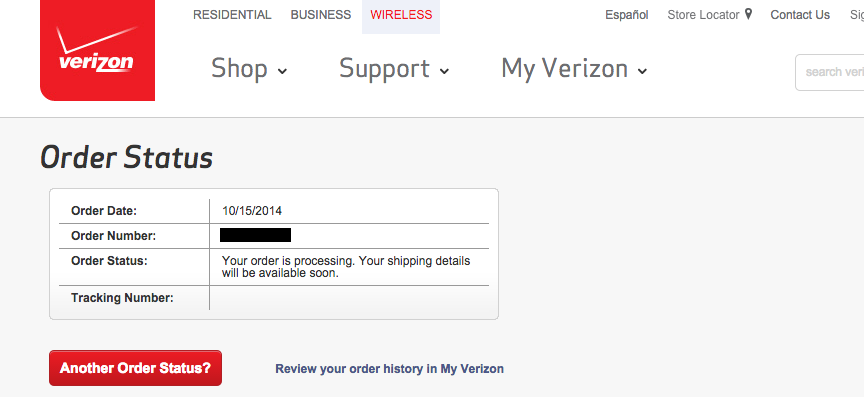 OK - to recap my experience: On October 15 I order from the Verizon Wireless website under my account, an iPhone 6+, 64 GB, Space Grey. The expected ship by date was (and still is) November 14. I received an email confirmation that had my order details, confirmed ship by date and my order number. The email also had a link to check my status. I checked that status constantly and to this day it say "Your order is processing. Your shipping details will be available soon." It also has my order date, order number and Tracking number which is blank.