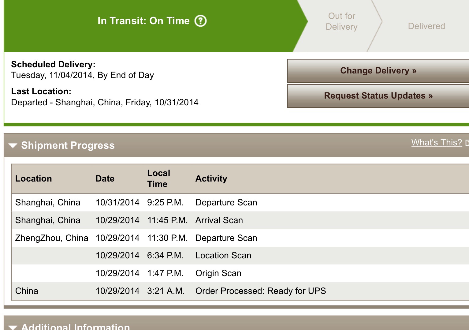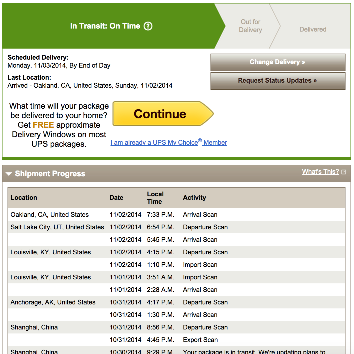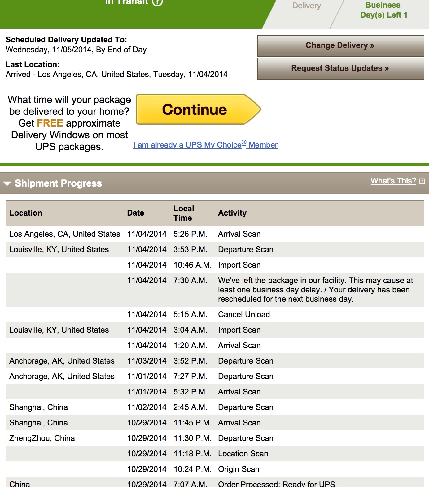 @Skott79, Congrats on getting your phone, the wait is almost over for you. I'm curious if your arrival scan in Louisville showed up over the weekend, or if this just all appeared last night? My status hasn't updated since Friday night when it left Anchorage, and I still don't have a delivery date. Originally the delivery date was Oct 31, then it rescheduled... then it changed to this on Friday night and hasn't updated since. I also paid for the 2-3 day shipping and ours travelled together out of Shanghai.