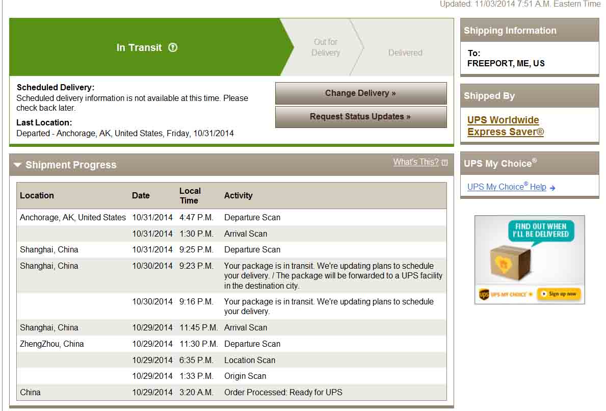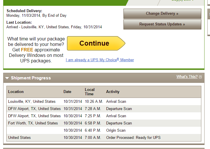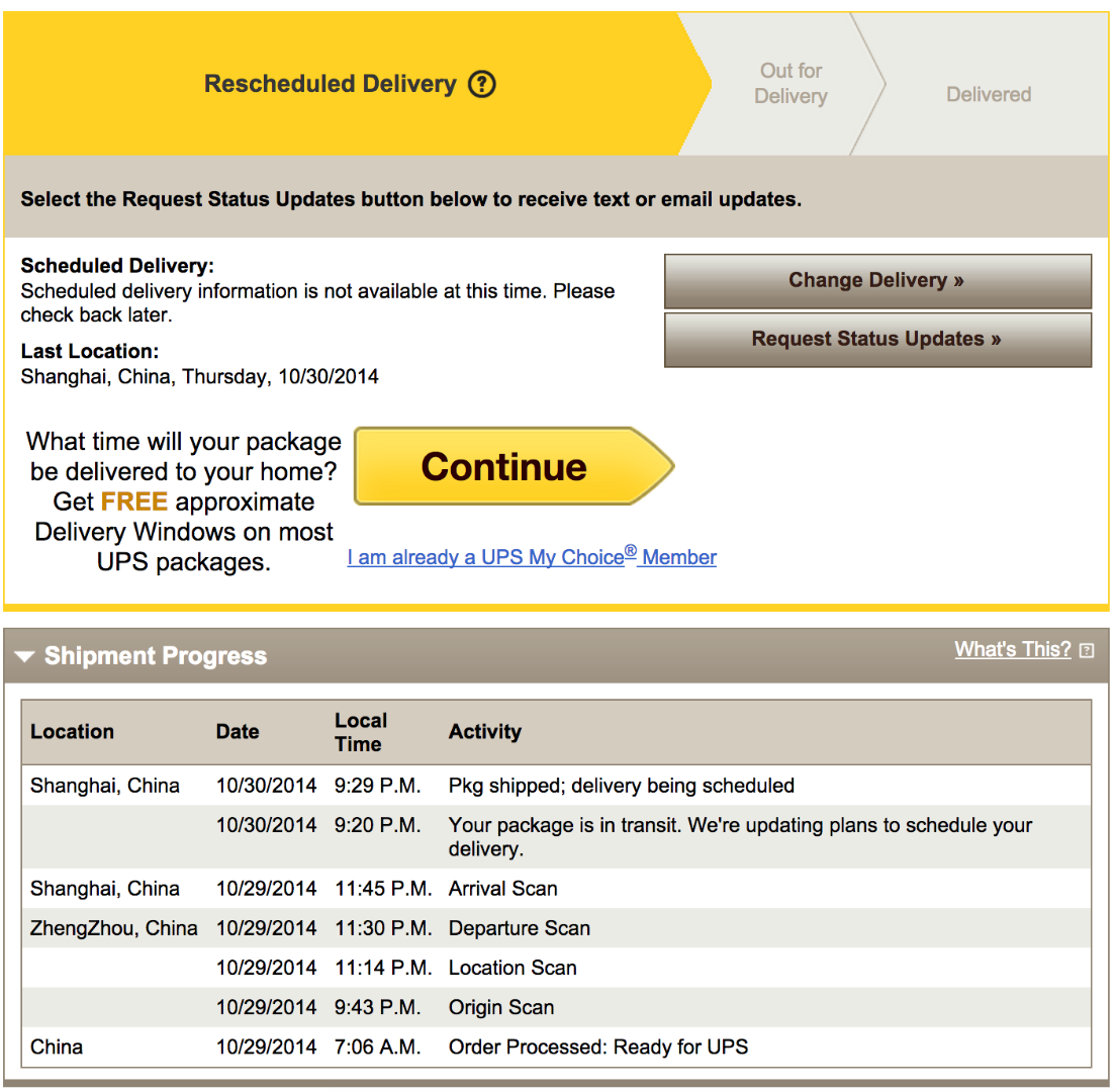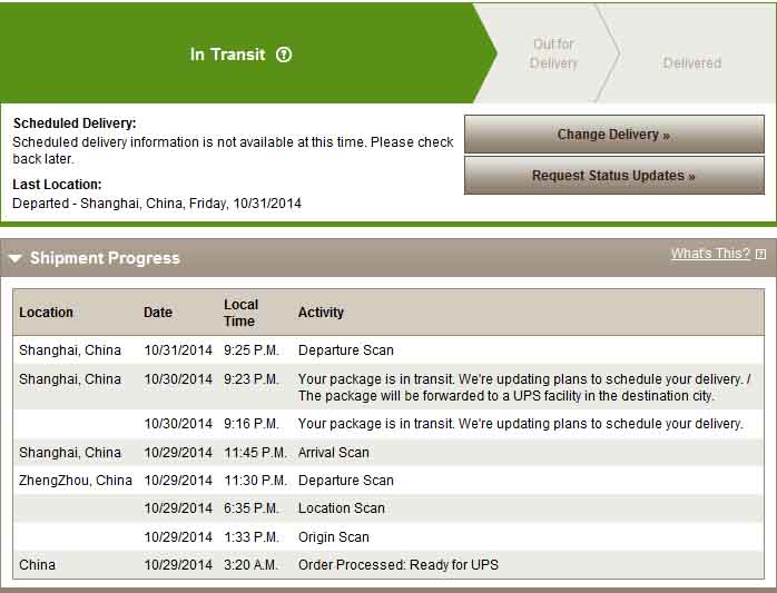@Skott79, Congrats on getting your phone, the wait is almost over for you. I'm curious if your arrival scan in Louisville showed up over the weekend, or if this just all appeared last night? My status hasn't updated since Friday night when it left Anchorage, and I still don't have a delivery date. Originally the delivery date was Oct 31, then it rescheduled... then it changed to this on Friday night and hasn't updated since. I also paid for the 2-3 day shipping and ours travelled together out of Shanghai.