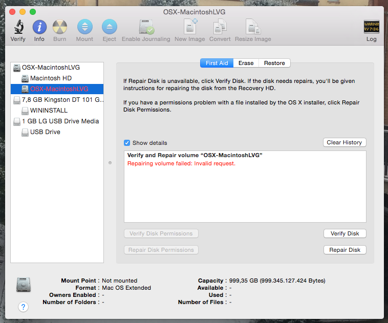 Disk: /dev/disk1 geometry: 121601/255/63 [1953525168 sectors]