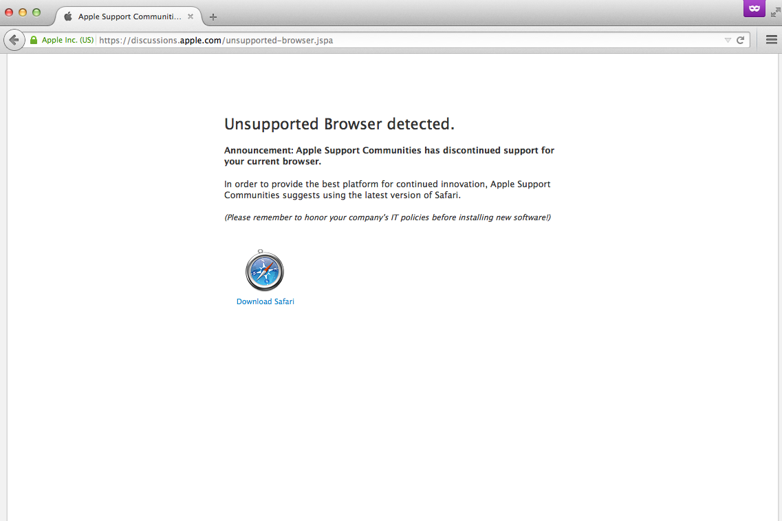 In order to provide the best platform for continued innovation, Apple Support Communities suggests using the latest version of Safari."