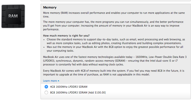 However, after a little digging. I believe it IS user upgradeable, because if we look at the Macbook Air, Macbook Pro and iMac 21.5 inch, which are all known to be non user RAM upgradeable. Under the RAM upgrade section of each item. Apple places a little note telling the buy that it is not user upgradeable (although very misleading, because you have to click on the expansion arrow "Learn more," by default this is not open!!!).