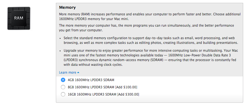 The next picture is of the MAC MINI 2014 right after the keynote Oct 16, 2014. It does not leave a note about RAM not being user upgradeable. For example: