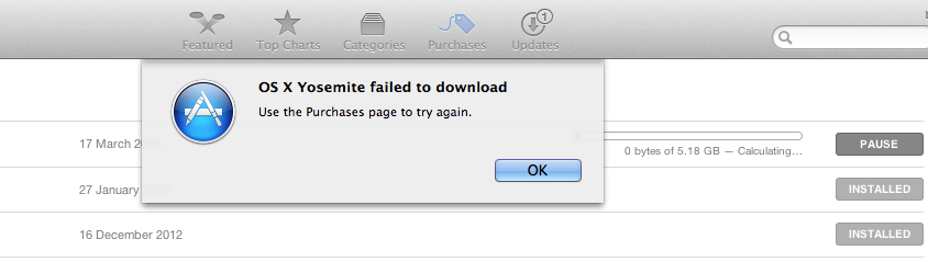 i got message "OS X Yosemite failed to download" "Use the Purchases page to try again."