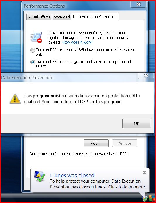 iTunes 12 incompatible with Windows Vista Data Execution Prevention