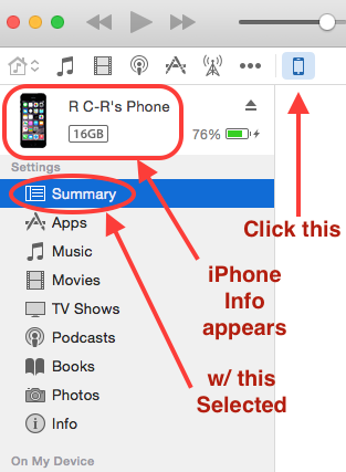 But assuming it does appear, click on that icon. (It doesn't matter what view or media type you are using.) What should happen is the sidebar should appear automatically, with the iPhone listed at the top of the sidebar. Below that a "Settings" section should appear with the "Summary" item initially selected, something like this: