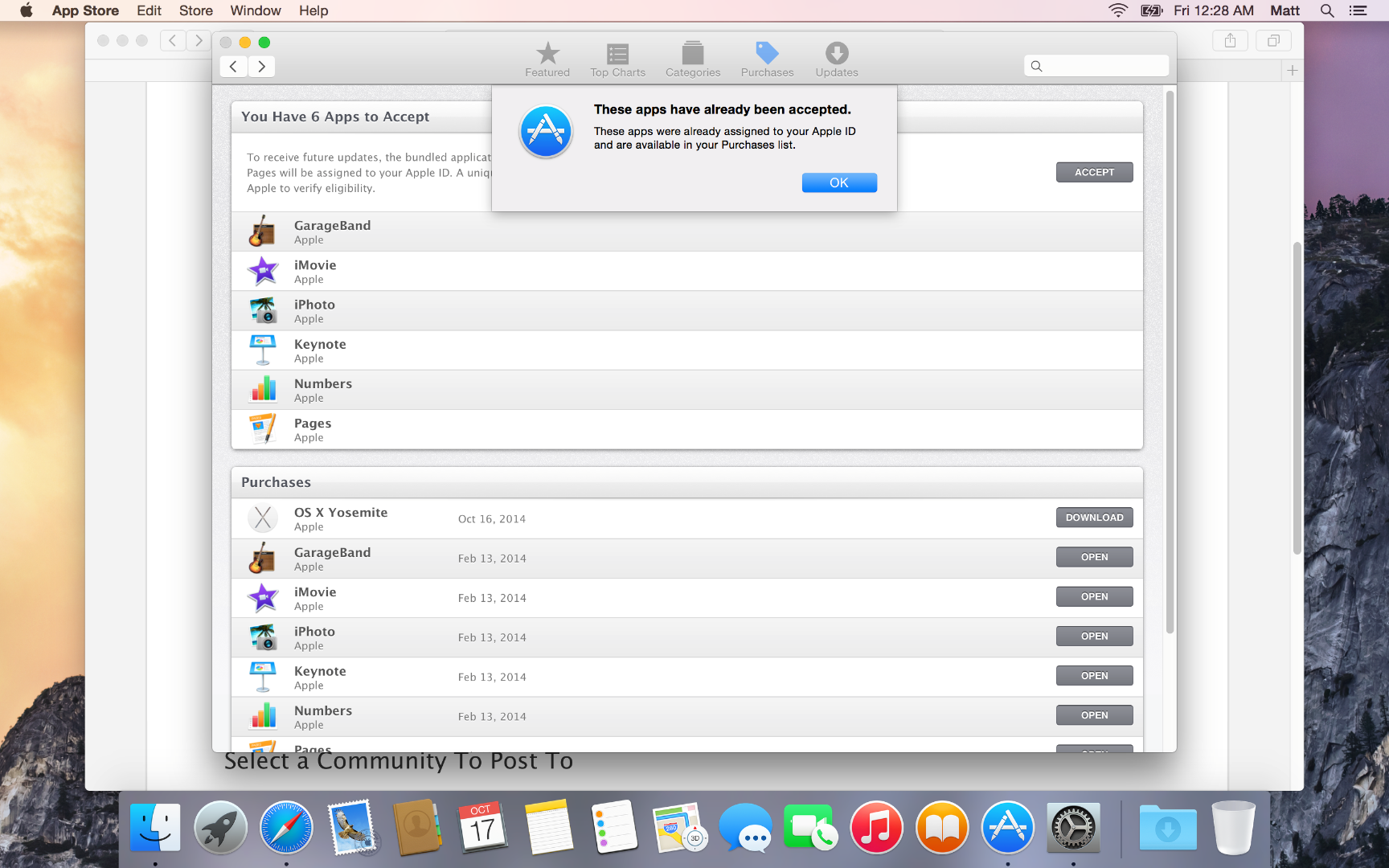 I reformatted my HD and had OS X Yosemite reinstalled. When I go to my "Purchases" page in the App Store I have a list of Apps to "Accept." However, when I click "Accept" and put my password in it tells me 'These apps have already been accepted" which is true. Under the list of 6 apps I have to accept it shows my purchases which includes those 6 apps. I can install and use them no problem. It is just a minor annoyance that whenever I look at the "Purchases" page I have this list of 6 apps it is telling me to accept, and there is no way to get this to go away.