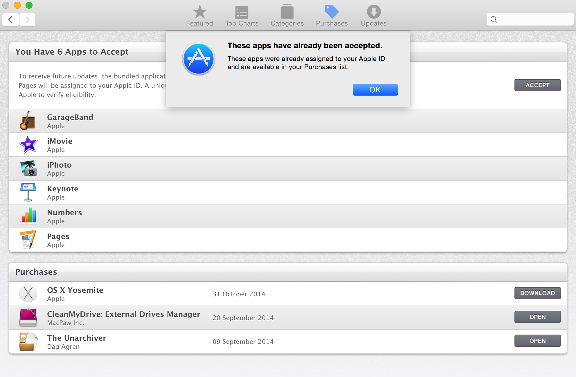 I reformatted my HD and had OS X Yosemite reinstalled. When I go to my "Purchases" page in the App Store I have a list of Apps to "Accept." However, when I click "Accept" and put my password in it tells me 'These apps have already been accepted" which is true. Under the list of 6 apps I have to accept it shows my purchases which includes those 6 apps. I can install and use them no problem. It is just a minor annoyance that whenever I look at the "Purchases" page I have this list of 6 apps it is telling me to accept, and there is no way to get this to go away.