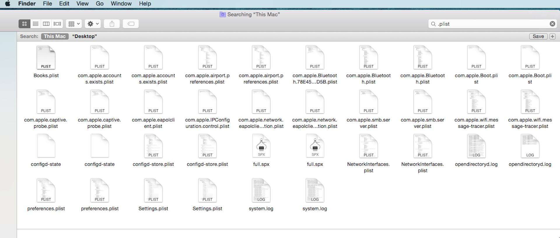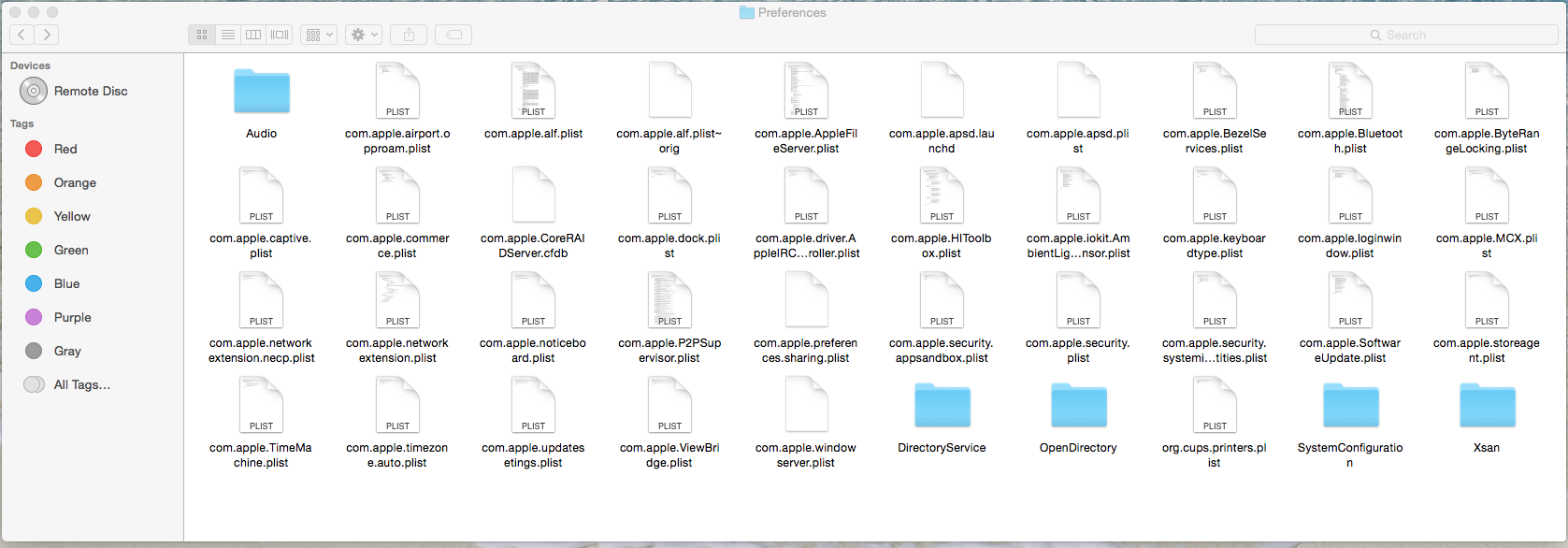 Next, highlight one of the plists, I did a Bluetooth plist. On the bottom of the window you will see the path to that plist. If you do not see the Preference Folder in the path, it's a duplicate in the wrong app/program folder and will not run properly. Turns out all these were that way except the Booklist plist. He deleted CMD+DEL all the files in this window. Then he did a shutdown. When he restarted he did the search again and this is what came back.
