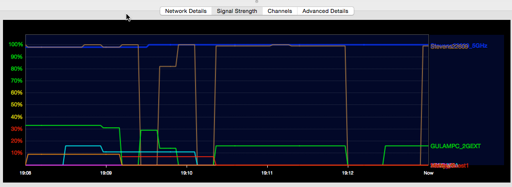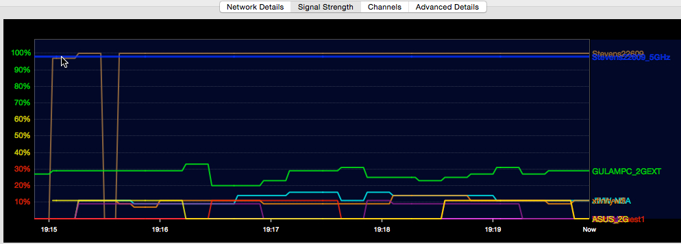 Bluetooth seems to be the core of the problem. I'm running a 13" MacBook Pro Retina 2014 with Yosemite installed. I have a 3T Airport Time Capsule and it sits on the desk near the laptop. As a diagnostic tool I'm running WiFi Explorer (in the Mac Store and highly recommended). I will attached two images from this tool. The first shows typical 2.4 GHz (BROWN) and 5 GHz (BLUE) signal strength in my "normal" configuration (laptop cover closed, Bluetooth ON, and a Thunderbolt display, keyboard, and track pad in use). Notice that the 2.4 GHz line (BROWN) drops repeatedly for up to 1 minute.