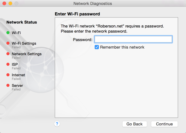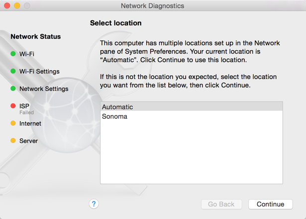 What is concerning is that I see various failures on the Network Diagnostics screen. I'm pretty sure I've seen the Network Status fail at every setting but Server: