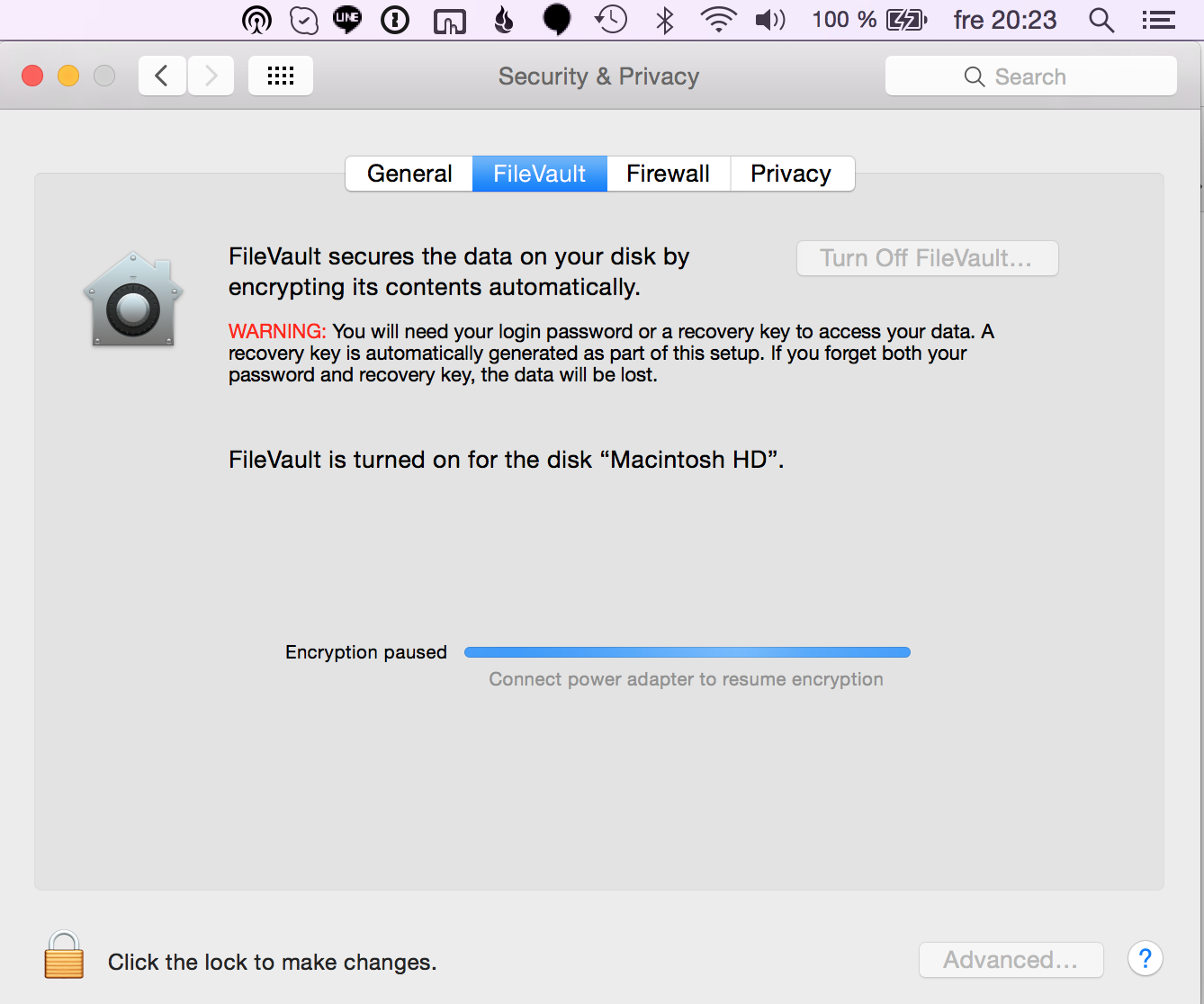 Then after the reboot, I accessed the System Preferences / Security & Privacy / FileVault and noted the drive being decrypted.