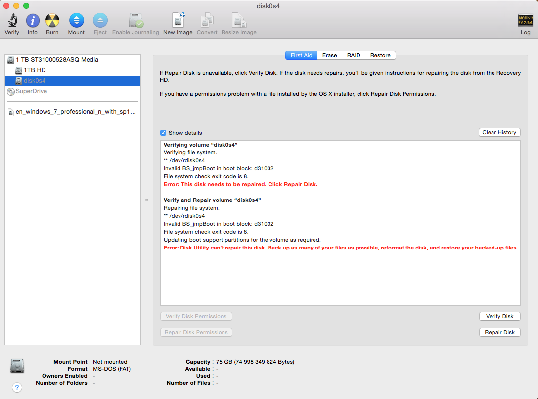 The Boot Camp partition is not there. But there's a new partition (Have not seen it before) called disk0s4 and it needs to be repaired. I assume this is my no longer working Boot Camp partition (?)