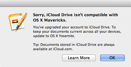 The real pain in the arse with Yosemite is when you enable iCloud Drive. It is incompatible with the Mavericks (and earlier) iCloud. I have two Macs, one with Mavericks, and the other with Yosemite (iCloud Drive enabled). Every time that I launch Pages v5.2.2 on Mavericks, it throws up a dialog (below) that I have to dismiss before I can access the underlying document. Your older Macs will not be able to see iCloud documents produced by Yosemite (with iCloud Drive on).