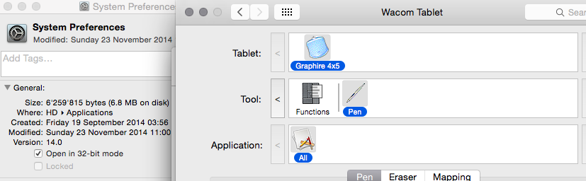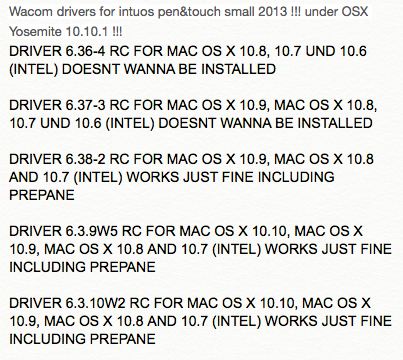 Just had an email from Wacom telling me that no new drivers are going to be produced for my tablet. It is an intuos 1 A3. Old yes but has been and continued to work perfectly well until they have dropped support with Yosemite. Really can't see why apart from forcing redundancy and purchase of new hardware. What a waste of a perfectly good product which cost nearly £500 when I bought it. They suggested not updating my OS. Also offered %20 reduction in their online retail shop. This was working out more expensive than buying a new tablet from Amazon with no discount. I had written a long letter to them expressing my disappointment at the company's stopping support for what is a long life product. The tech help said that additional features were on the new tablets which clashed with the old drivers but I don't see how an OS update should cause the problem. Perhaps Yosemite has required the rewriting of the prefs pane and they don't want to invest in updating the code in the old drivers.