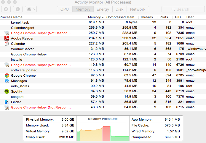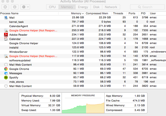 Since upgrading to Yosemite I have ran out of memory (MacMini, 16 Gbytes) three or four times. I have traced this to Mail.app. The trigger seems to be when you drag multiple files into the email to have them included. Then, the memory usage starts racing, eventually using up all free memory within seconds. The only way to recover is to use Force Quit from the Activity Monitor, normal Quit from within Mail does not work. See the attached screenshot. By the time I grabbed the screen shot and pressed Force Quit, it was already up to 17 Gbytes of Memory.