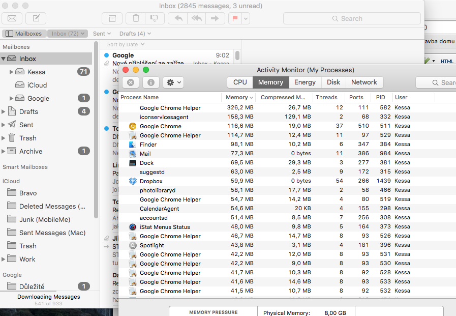 An out of memory warning was encountered. Selecting a specific email in the inbox with a PDF attached to it instantly starts chewing up memory, as it attempts to "preview" the PDF attachment, I imagine.