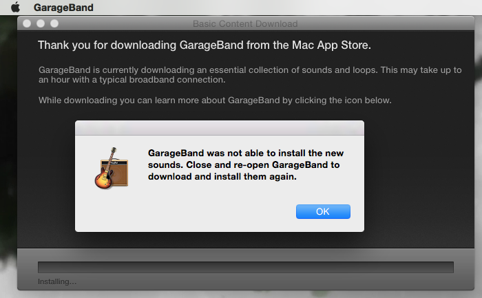 When I open it, it thanks for me downloading it, and then begins to download "an essential collection of sounds and loops." After a bit of downloading, it asks for my admin password; I enter it, and a few seconds later, it gives the error: "GarageBand was not able to install the new sounds. Close and re-open GarageBand to download and install them again." Closing and reopening GarageBand just takes me through the same loop (no pun intended). When the window is open, if I click on the GarageBand menu in the Apple bar, nothing happens.