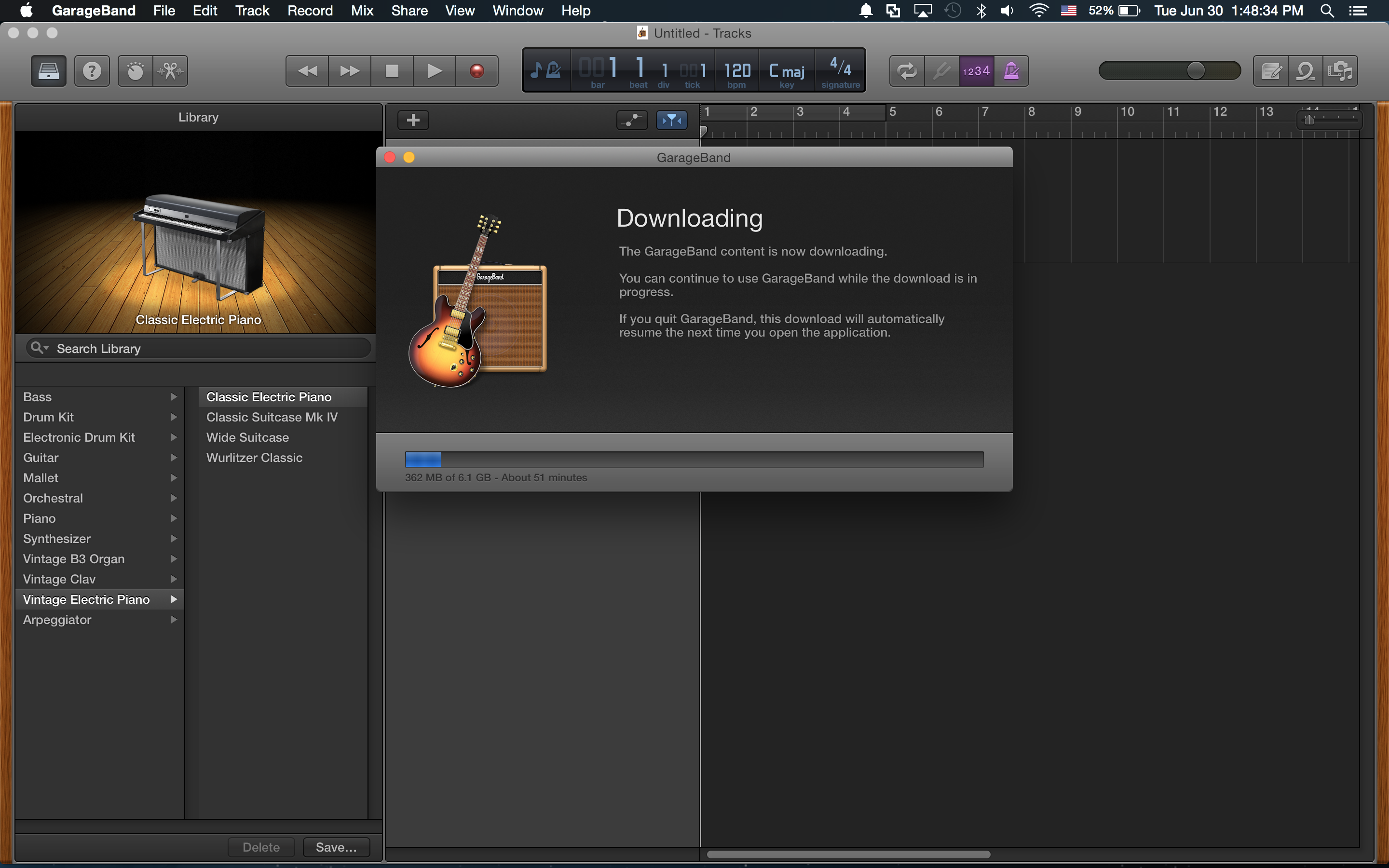 When I open it, it thanks for me downloading it, and then begins to download "an essential collection of sounds and loops." After a bit of downloading, it asks for my admin password; I enter it, and a few seconds later, it gives the error: "GarageBand was not able to install the new sounds. Close and re-open GarageBand to download and install them again." Closing and reopening GarageBand just takes me through the same loop (no pun intended). When the window is open, if I click on the GarageBand menu in the Apple bar, nothing happens.