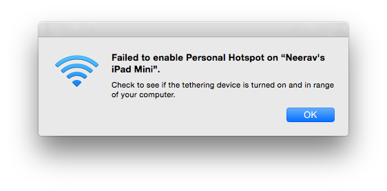 Performed the iOS update to 8.1 and the instant hotspot isn't functioning. Whenever I try to connect from my MacBook I get the error: Failed to enable Personal Hotspot on "Tim's iPhone" - Check to see if the tethering device is turned on and in range of your computer.
