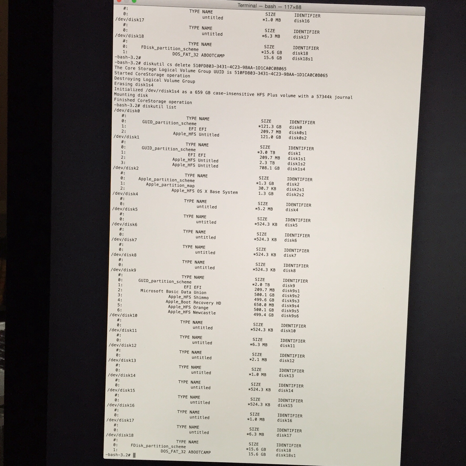 4. Please post the output of diskutil list when done. (I should apologize for all the picture taking/tedious process of screen shots). Recovery does have a Safari browser which can be used to copy/paste to this discussion. You are welcome to try that method, if it reduces your efforts.
