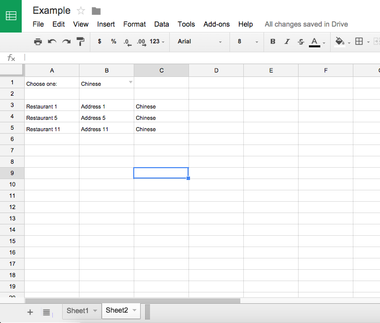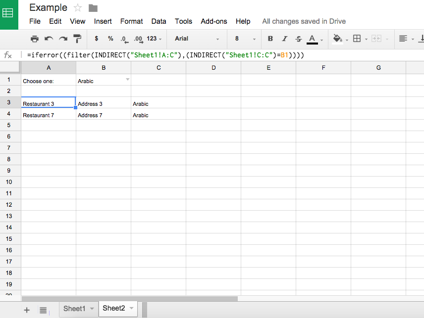 2. In Sheet 2 have a cell I can put like "Chinese", and it shows all the Chinese restaurantes from Sheet 1.