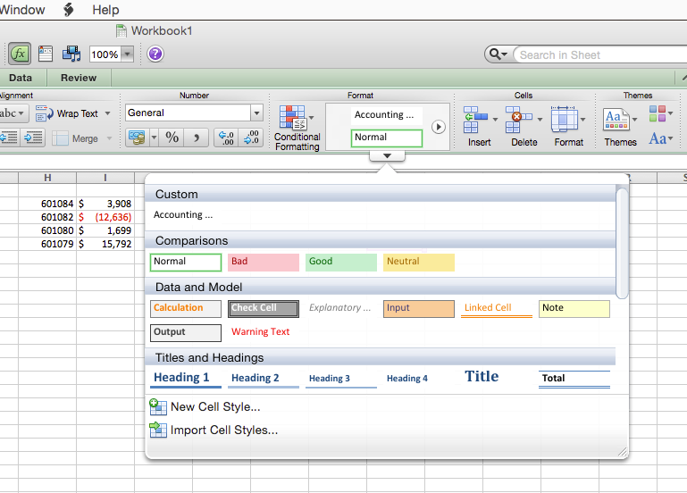 I applied that "custom" number format to the numbers then selected it, and clicked over to the format area, next to the numbers area. Towards the bottom there's the little down triangle, then I clicked on new cell style. Since I had the cell I had done "custom" to already selected, all of the info was accurate, so I just named it what I wanted (Accounting) and saved it. Now I just click on accounting in the format section instead of the accounting in the numbers section.