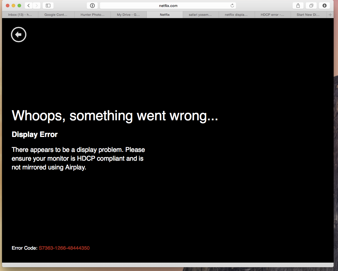 I can't help but see these two issues as related. In both cases, the problem is solved by disconnecting the 2nd monitor! What is wrong with Apple's operating system that the 2nd monitor is interfering with programs on the primary monitor? Shouldn't it just be looking at what it's connected to rather than considering what else is connected to your system? Someone on here says the problem is political or something. That's nonsense unless you think Silverlight should be the default. Apple needs to fix their operating system so this is not an issue. Telling met it's HDCP when both monitors are HDCP compliant is just SAD. What's sadder is that Apple and/or Netflix has not fixed this problem in over a year now. That's RIDICULOUS.