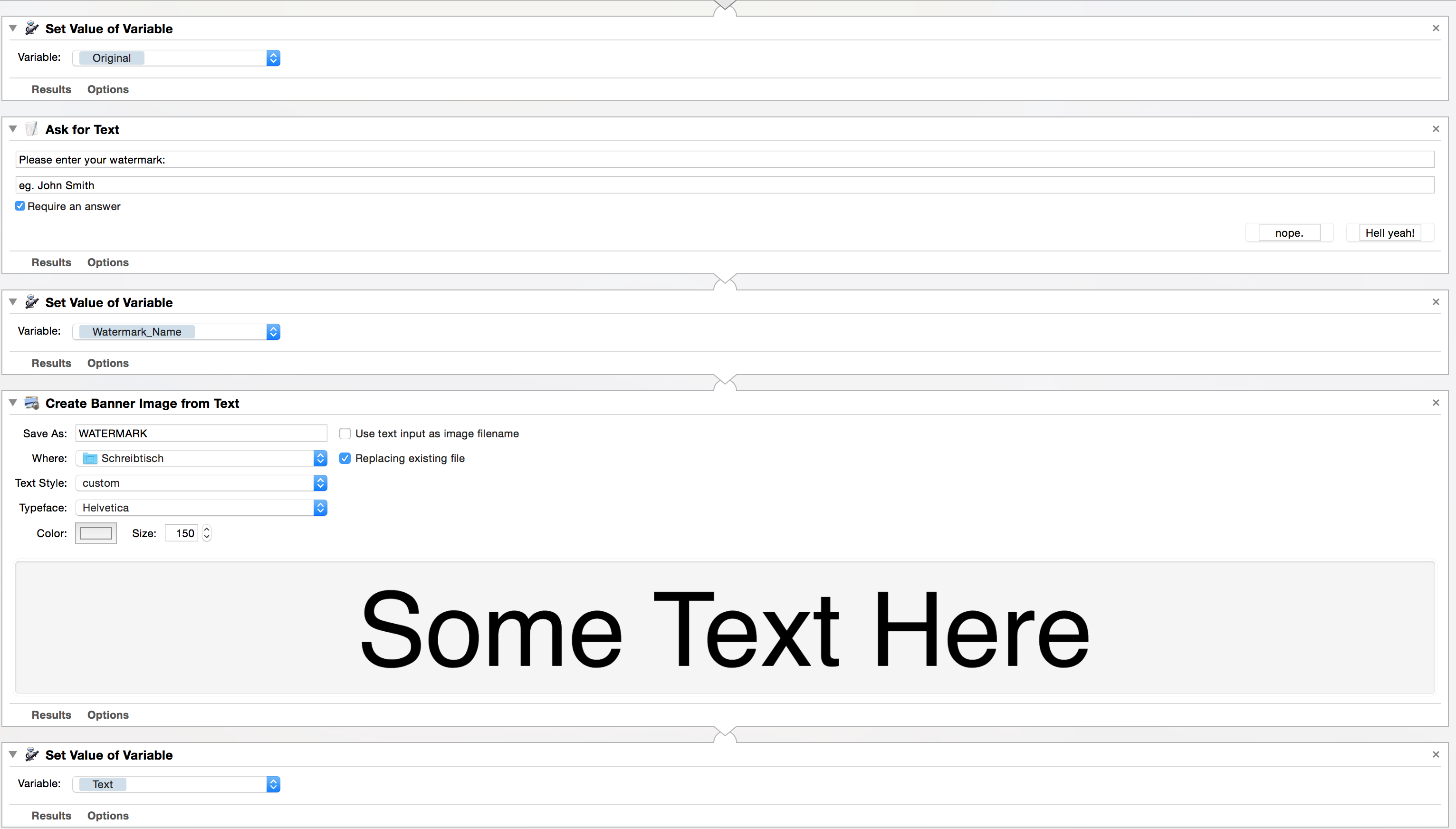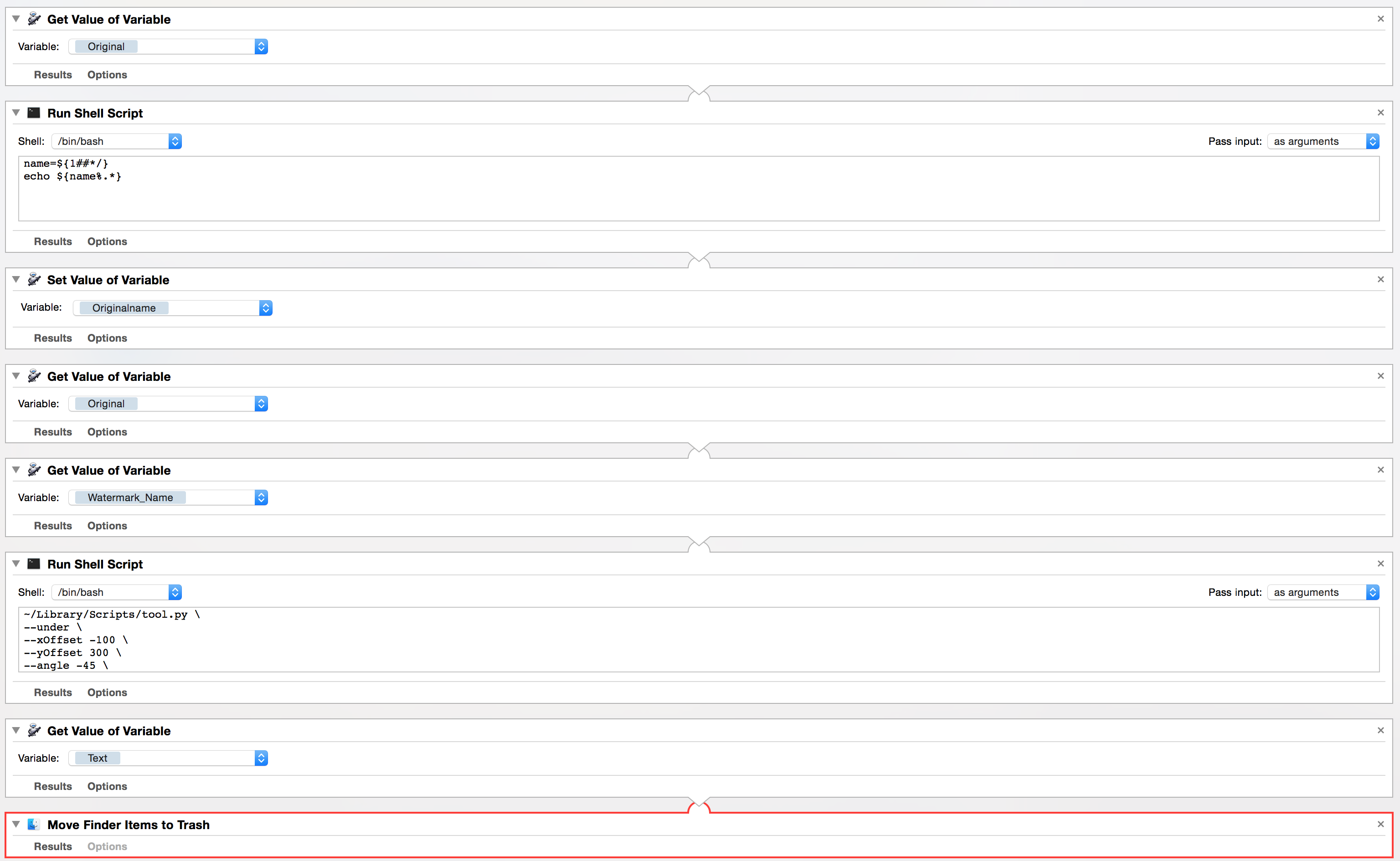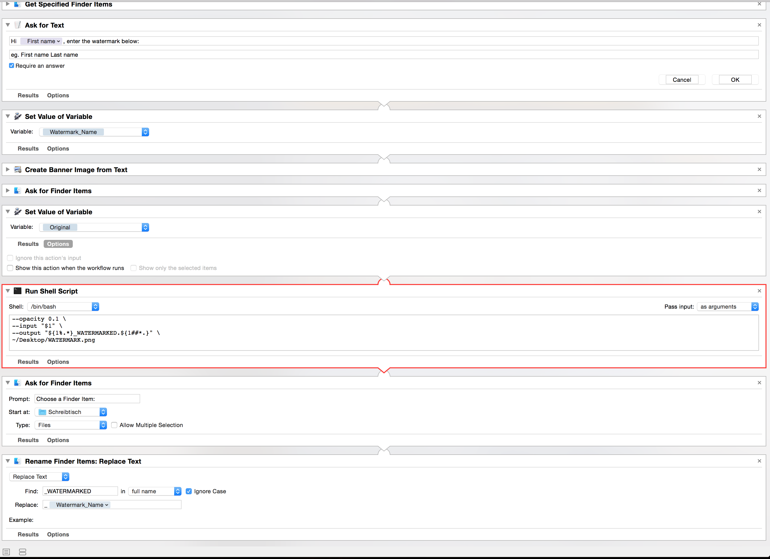 1) I would like to just drop the pdf onto the workflow and enter the watermark I need. However if I ask for the pdf first the shell script will take the watermark png as input and not the pdf. Any ideas how to change that? I already tried to set the pdf as a variable and to get that variable before the shell script is called. That didn't work out.