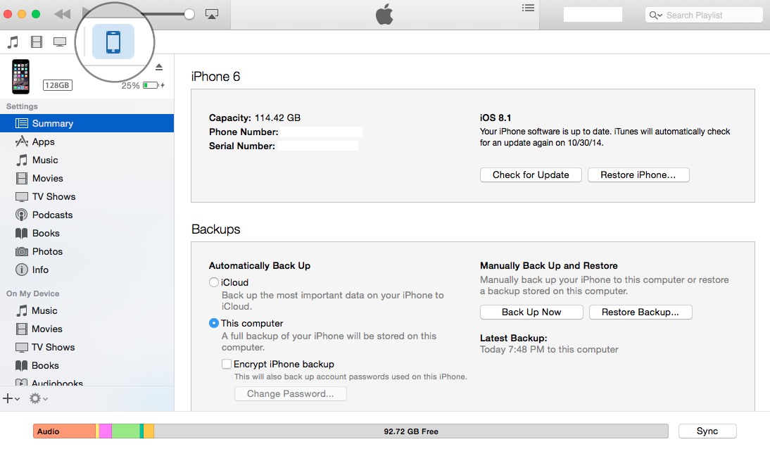 Here are some images to help you out. Please be sure to first plug your iPhone in or enable "Sync with this iPhone over WiFi" and be running the latest version of iTunes.