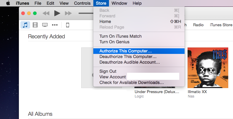 3) It appears I was mistaken on the "Advanced" menu, my apologies. It is no longer in iTunes (I believe it was removed with iTunes 11). The option is now located under Store -> "Authorize This Computer..." Selecting this will give your computer full permission to access any content you have purchased through iTunes. I have not personally used podcasts in a few years, but I'd imagine it will apply as well. Sign in using the Apple ID that you have purchased content with and you should have unrestricted access. Keep in mind that you may have up to 5 authorized computers at any given time. To authorize a 6th computer, you will need to go to one of the other machines and select "Deauthorize This Computer..."