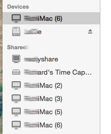 I had noticed a couple duplicates before (even with Mavericks) but now there are suddenly 5 "iMac"'s showing under Shared & Devices in Finder. What's going on? There's only one iMac and two WIN PC's on network. Been this way for years.