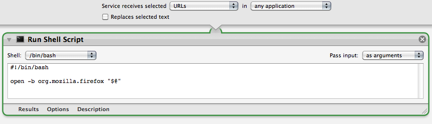 I'm trying to make a service on OS X Yosemite that will allow me to click on the URL at the top in Safari, then open it in Firefox. Saving my having to copy, open up Firefox and then paste it in. I've found a screenshot of something similar to what I'm trying to get, only in there it say 'Open URL in Opera' not Firefox. Can anybody help?